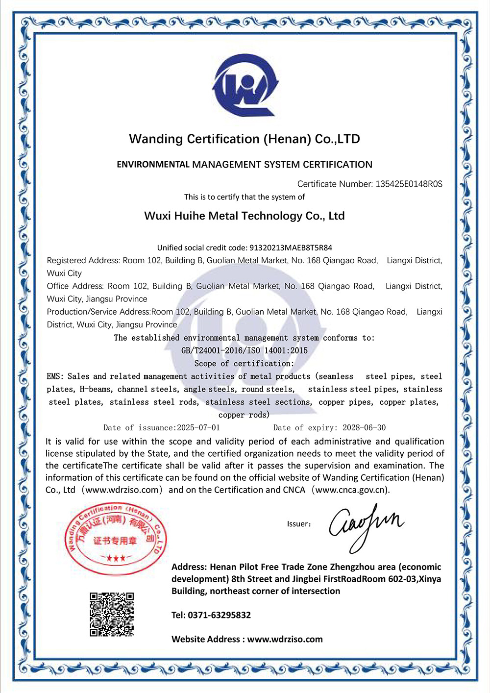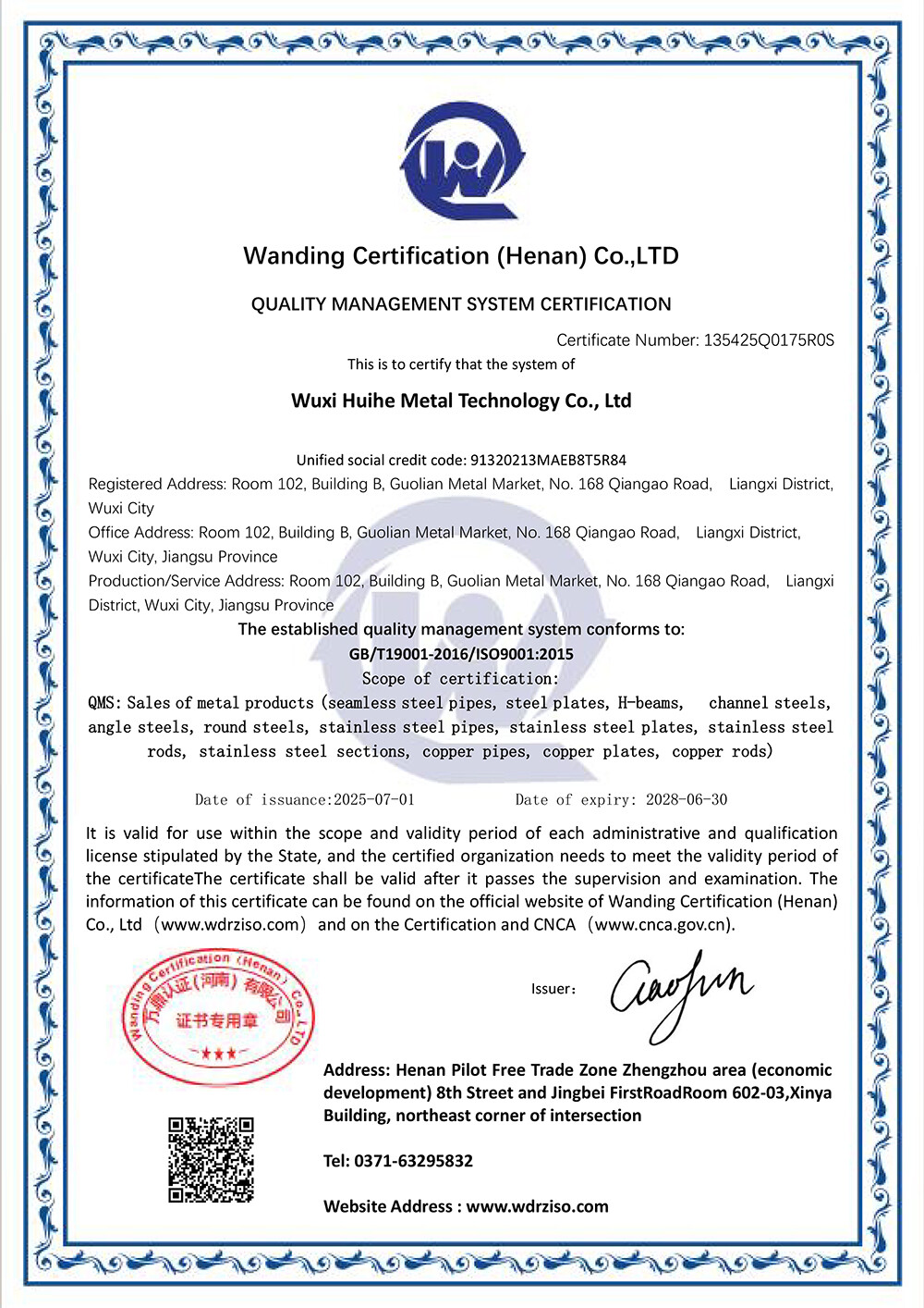 Wuxi Huihe Metal Technology Co., Ltd. is a manufacturer specializing in the research and development, processing, production and sales of stainless steel, carbon steel, galvanized, aluminum and other series. The main products include steel plates, steel coils, steel pipes, steel pipe rods, steel pipe fittings, profiles, etc.